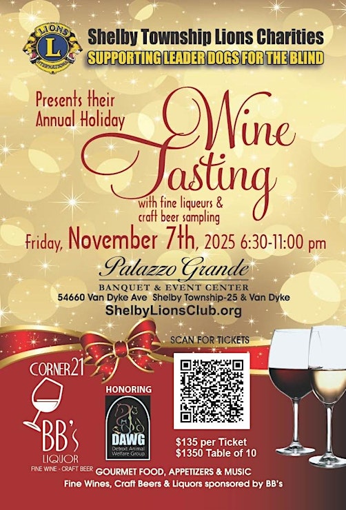 Join us for the 2025 Wine Tasting Fundraiser Presented by the Shelby Township Lions Club!